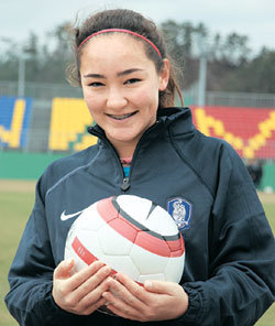 圖爲14日在慶尚南道南海體育場與韓國青少年(17歲以下)女子足球隊一起訓練的凱特·艾德沃茲(音譯)。目前就讀于美國加利福尼亞韋斯特雷科高中(音譯)的艾德沃茲爲了能代表母親的祖國——韓國活躍在世界足壇,正在進行刻苦的訓練。她在場上的位置是中後衛。