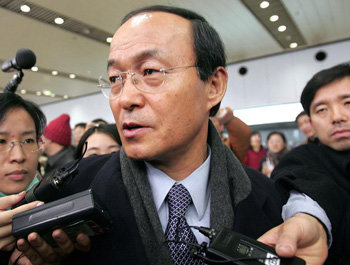 北核問題六方會談韓方首席代表外交通商部次官補宋旻淳於17日爲討論對北韓擁有核武器及無限期中止參加六方會談聲明的對策而訪問了中國。圖爲,抵達北京機場的宋旻淳正在回答記者的提問。