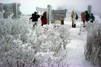 可稱得上登山勝地的太白山(海拔1576米)盛開著漫山遍野的“雪花”。18日,登上江原太白市太白山山頂的遊客們沈浸在“銀色世界”的感慨之中。因江原地區普降暴雪,周末遊覽太白山的遊客從平日的4000人次劇增至8000人次。