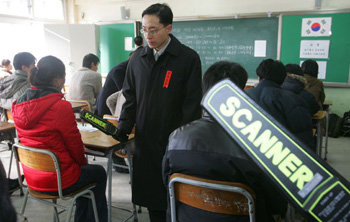 自去年發生高考手機作弊事件後,在各種考試中防止作弊成爲人們最關心的問題。25日,在舉行第49屆行政高等考試第一次考試的首爾瑞草區瑞草2洞永登中學考場,監考老師正在用便於攜帶的金屬探測器檢查考生有沒有攜帶手機和無線傳播工具。