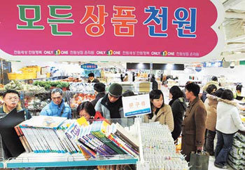 被稱爲“1000韓元商店”的統一價商店再次受到關注。圖爲,最近,在首爾明洞一家1000韓元商店,“精打細算族”在3000多件展示物品中正在挑選所需的物品。