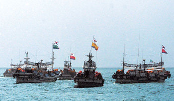 慶北郁陵郡議會議員等165名鬱陵郡民1日白天在獨島東島港口舉行3.1節紀念儀式,敦促“日本政府和根島縣立即停止獨島所有權電視廣告和制定‘竹島(日本對獨島的稱呼)之日’並進行道歉。”圖爲郡民們從鬱陵島分乘捕魚船,向獨島進發。