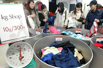 “衣服每10克300韓元。”位於漢城鍾區明洞綜合購物中心Avata 的賣場“kg shop”上推出了論斤出售衣服的活動。2日,來到這裏的顧客正在挑選衣服。