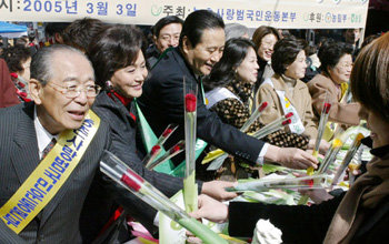 農村情泛國民運動總部于3日上午在首爾明洞舉行了“農村情100萬會員加盟運動”。參加當天活動的全經聯會長薑信浩(左)爲傳達“都市人的農村情”向市民發放了玫瑰花。100萬會員加盟運動將於6月9日結束。