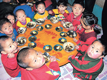 據悉,北韓政權繼續開發核武器等對加強軍備投入了龐大的預算。相比之下,兒童和産婦營養失衡現象日益嚴重。聯合國兒童基金會(UNICEF)和世界糧食計劃署(WFP)7日在中國北京舉行聯合記者招待會表示,與2年前相比,産婦缺乏營養的情況進一步惡化。在出生不到6個月的嬰兒中,三分之一以上的嬰兒得不到充分的母乳供應。圖爲WFP當天公開的平安北道塩州郡一所幼稚園的兒童吃午飯的場面。
