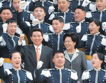 盧武鉉總統和夫人權良淑女士8日在忠北清原郡空軍士官學校舉行的第53屆空士畢業及任職儀式上,和畢業生一起高喊“加油”。盧武鉉在當天發表了對駐韓美軍的戰略上的靈活性和美國具有的戰時作戰統治權的收回等敏感懸案的想法。