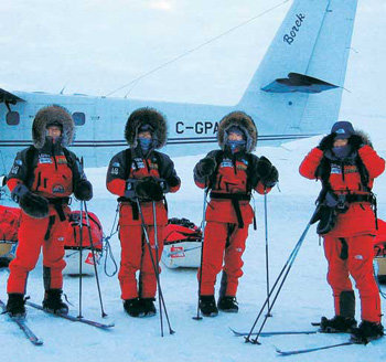 編寫人類新神話的挑戰終於開始。朴永碩隊長帶領的北極點遠征隊於9日上午1時30分(當地時間8日上午10時30分)在位於北緯83度3分090秒、西經74度6分431秒的加拿大最北端沃德亨特,開始了步行大長征。在嚴寒和強風下,遠征隊將在60天內行走2000公里。出發之前,遠征隊決心只要有百分之一的可能性,也決不放棄。圖爲,在出發前,隊員洪成澤、吳熙俊、鄭燦一和隊長朴永碩(左起)並排站在飛機前。
