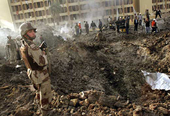 9日淩晨,在位於伊拉克巴格達中心街的一家酒店附近,一輛裝有炸彈的垃圾車發生了爆炸,導致至少4人喪生,數十人受傷。外電報道說,此次炸彈恐怖襲擊針對的是西方勞務人員所住的酒店。圖爲,美軍和伊拉克警察正在巡視爆炸現場。