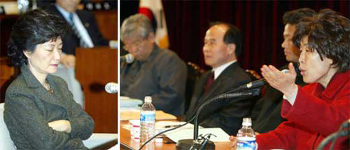 圖爲,9日在國會舉行的議會總會上,大國家黨代表朴槿惠(左,照片)閉著眼睛聽《行政城市法》反對派議員們的發言。爲抗議通過《行政城市法》,已絕食示威7天的大國家党議員全在姬(右)當天面容憔悴地出席了在國會舉行的“爲阻止大國家黨分割首都的大討論會”,指出了建設行政城市的不當之處。