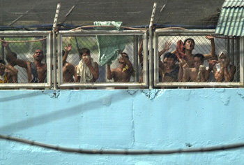 14日,被關押在菲律賓首都馬尼拉郊外的監獄的伊斯蘭恐怖組織阿布·薩耶夫成員們發動了暴動,造成22人死亡。暴動當天就被鎮壓。圖爲,在鎮壓過程中,因投放催淚彈監獄內充滿了煙霧,囚犯們正大聲呼救。