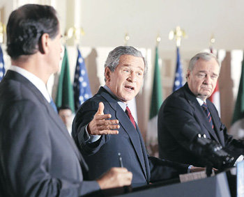 23日,在美國德克薩斯州韋科的貝勒大學,美國總統喬治·W·布希(中)、加拿大總理保羅·馬丁(右)、墨西哥總統比森特·福克斯在三國首腦會談結束後正在舉行聯合記者招待會。當天3國首腦宣佈了以加強通商與反恐合作爲主的“安全繁榮夥伴”宣言。