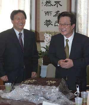 開放的我們党全北道党的幹部在25日毫無預告地來到了國會大國家党院內代表室,給院內代表姜在涉(右)送來了寫有“相生”字樣的蒸糕、辣椒醬、乾菜、海鮮醬等禮物。薑在涉答謝道:“因迎來了意外的客人而非常感動。”