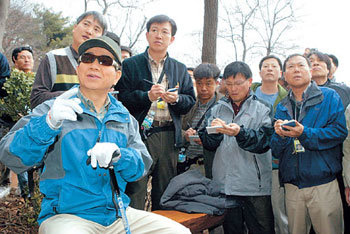 27日,盧武鉉總統(左)一邊和青瓦台專門記者一同攀登北嶽山,一邊表達了對主要懸案的想法。當天,盧武鉉雖然穿的是國產登山服,但所戴的帽子和墨鏡分別是德國B公司和美國O公司的産品,因而吸引了衆人的視線。