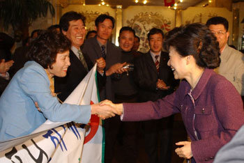 于29日訪問前總統金大中的故鄉全南新安郡的大國家黨代表朴槿惠(右)正在新安海濱酒店向前來歡迎的全南道党女黨員致意。