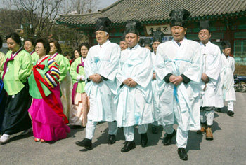 30日,在首爾鍾路區明倫洞成均館舉行了“成年人禮儀學校”開學儀式。學校分爲2個班,每次收90名學生,學期爲3周。該禮儀學校到6月末爲止隨時開課。圖爲,報名入學的“學生”正排隊走向下一個教室。