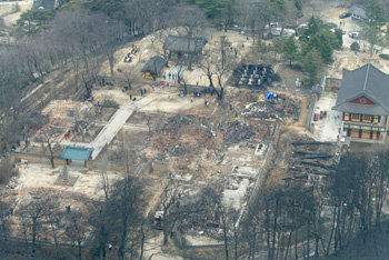 圖爲,被大火燒爲廢墟的江原蘘陽郡洛山寺全景。警方人員和軍隊將士們從6日上午開始,全面投入到了整理殘局、恢復重建的工作中。植樹日在江原蘘陽和固城地區發生的火災已于當天下午完全撲滅。火災發生原因目前尚不清楚,這場山火燒毀面積達400多公頃,包括160多棟住宅的246棟建築物也受到了嚴重破壞。另外,還出現了134戶340名災民。政府已將受害地區宣佈爲特別災難地區,正在積極討論出臺支援方案。
