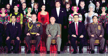 7日,北韓國防委員長金正日(前排中)在觀看了俄羅斯總統樂團演出之後,與樂團成員合影留念。