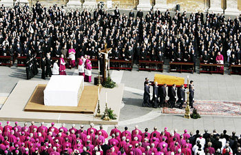 在舉行教皇約翰·保羅二世的遺體告別彌撒(葬禮儀式)之前,教皇的棺木正被運往聖彼得廣場。教皇的遺體雖然在8日被葬在了梵蒂岡教堂的地下墳墓中,但他的靈魂將在神的懷中得到永遠的安息。
