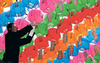 雖然距“浴佛節”(5月15日)還有一個多月,但各寺廟已經在忙著準備釋迦牟尼誕辰紀念活動。12日,在首爾鍾路區堅志洞曹溪寺,職員懷著對佛祖的虔誠在挂蓮燈。
