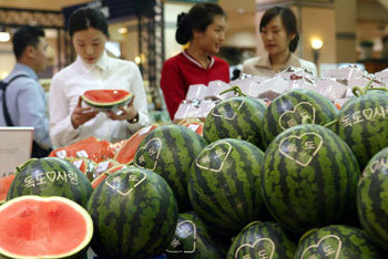 13日,在首爾一家百貨店出現了獨島西瓜。爲防止陽光照射,在西瓜皮上貼上了“關愛獨島”4個字,結果,貼字的部分呈白色。該西瓜由慶南昌原市一家農戶生産。
