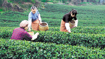 綠茶收穫季節來臨。13日,在濟州北濟州郡涯月邑古城裏一個綠茶田,人們正在忙碌地摘像麻雀舌頭一樣尖細的綠茶葉。在雨生百谷的穀雨(4月20日)之前收穫的綠茶被稱爲“雨前”。