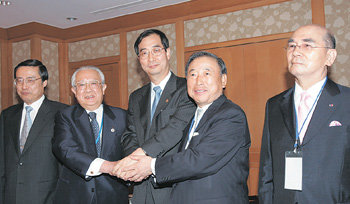 在14日舉行的韓日、日韓經濟人會議上,兩國團長中間隔著副總理兼財政經濟部長官韓德洙正在握手。右起依次是,韓日經濟協會名譽會長朴泰俊(音譯)、韓日經濟協會會長趙錫來、副總理韓德洙、日韓經濟協會會長瀨戶雄三、日本駐韓大使高野紀元。