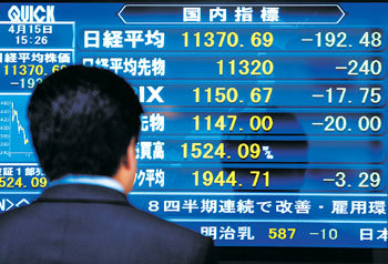 三星電子業績不振的消息對日本股市帶來了衝擊。因IBM發表了讓人感到失望的業績,開盤前東京股市就顯示出了不祥預兆,15日上午三星電子發表第一季度業績後股市全盤下跌。當天,日經指數相比前一天下跌192.48日元(1.66%)。15日,東京一家證券公司營業廳中,一位投資者正在觀察著股指走勢圖。