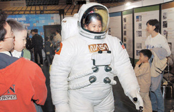 17日,在首爾松坡區奧林匹克公園體操場舉行了“2005年家庭科學慶典”。圖爲參加慶典的兒童穿著宇航服模型,興高采烈。從16日開始舉行的該活動爲期兩天。同時,還舉行了“想象繪畫比賽”和“八道機器人行進比賽”。
