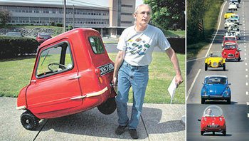 17日,在美國田納西州納什維爾經營“萊恩(Rain)汽車博物館”的萊恩用一隻手舉起了世界上最小的汽車“PEELE P50”(左)。萊恩當天與其他小型汽車愛好者在菲斯福力斯特湖(音譯)附近共同舉行了微型汽車比賽。
