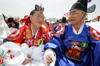 圖爲,19日參加在全南求禮郡求禮邑徐市川舉行的第2次全國長壽夫妻集體回婚禮的張德洙老爺爺(音譯,91歲,右)和朴基愛老奶奶(音譯,82歲)。據說這對老夫妻已經迎來了結婚62周年。回婚禮是紀念夫妻結婚60周年的儀式。