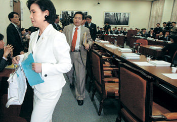 21日,爲了審議2004年度KBS決算舉行了國會文化觀光委員會。在KBS方面拒絕提供挪用公款等相關資料之後,大國家党議員紛紛退場,導致會議流産。圖爲,繼朴贊淑議員之後,沈在哲跟著走出會場。