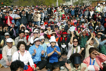 24日星期日,在京畿城南市中院區舉行的一場重新選舉候選人的遊說中,選民們正在鼓掌。