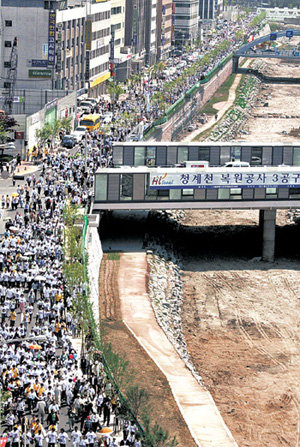 將於10月1日竣工的首爾清溪川工程1日向市民露出了自己的“面目”。當天,作爲“你好!首爾2005”紀念活動的一環舉行了“預先觀看清溪川市民步行大會”。參加大會的3萬多名市民沿著中區黃鶴洞一帶清溪川北面車行道,觀察了復原現場。清溪川復原工程目前已進行了90%以上,照片中最前靠前的橋是黃鶴橋。
