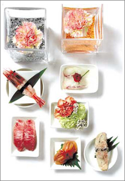 ▽康乃馨+水+丙烯酸盒=在透明的丙烯酸盒中裝15釐米高的水,並把小石子放在下面。之後放入與石子顔色搭配的康乃馨。康乃馨透過丙烯酸盒散發出絢麗的色彩。作爲裝飾品使用最合適。