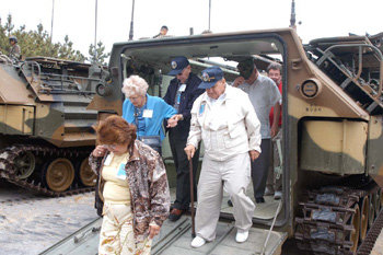 迎接6·25戰爭50周年,美國海軍參戰勇士訪問團于8日訪問了海軍第1師,受到了部隊官兵的熱烈歡迎。訪問團由15名參戰勇士和3名家屬等19人組成,他們與部隊官兵共進午餐後還進行了乘坐韓國型水陸兩用裝甲車活動。