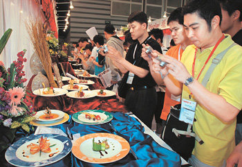 10日,在香港會議展覽中心舉行的“2005香港國際食品展覽會(HOFEX)”上,觀衆們正在對開胃菜拍照。HOFEX是展示食品和飲料、加工食品、食品相關服務以及各種器材的香港最大的食品展覽會。此次展覽會將舉行到13日。美國、日本、法國、韓國等全世界35個國家1800多家企業參加了這次展覽會。