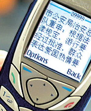 中國上海公安機關上月15日向市民發送的手機短信。上面顯示“根據法律規定,街頭示威要經過政府的允許,群衆的愛國熱情應該有理性、有秩序地體現出來。”