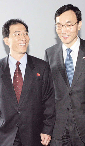 圖爲,16日,韓國代表團首席代表、統一部次官李鳳朝(右)和北韓代表團首席代表、祖國和平統一委員會書記局副局長金萬吉一起步入舉行南北副部長級會談的開城子南山賓館會議室。南北首席代表當天就正常恢復南北關係達成了共識,但就恢復的具體方法産生了分歧。