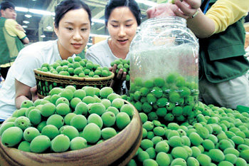 17日,韓國農協Hanaro俱樂部首爾良才店推出了在海拔400米栽培的京南河東山青梅實。青梅實不僅酸味濃重,而且果香濃厚,加上果肉堅硬,因此成爲泡制梅實酒的佳品。10公斤重一箱的青梅實價格在5萬~6萬韓元之間。