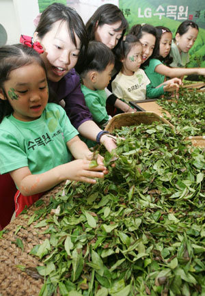 22日,在首爾江南區論峴洞LG化學裝飾展示場舉行了綠茶園體驗教室活動。圖中,參加活動的小朋友們正在好奇地觸摸生綠茶葉。在LG化學公司主辦的當天活動中,小朋友們利用生綠茶葉親手製作了綠茶。