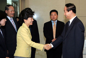 圖爲,大國家黨代表朴槿惠(左)23日在中國北京機場接受中國外交部有關人士的迎接。當天下午,朴槿惠會見中共中央對外聯絡部部長王家瑞,雙方就北韓核問題交換了意見。