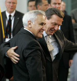 德國總理施羅德(右)30日在柏林迎接對德國進行正式訪問的以色列總統摩西•卡察夫。