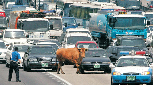 31日上午12時,在京釜高速公路板橋出入口附近,裝載著5只黃牛飛馳的卡車發生了翻車事故。圖爲,因該事故從卡車中逃出來的1只黃牛正在高速公路的中央悠閒漫步。雖然動用警方119救助隊抓住了黃牛,但是因此造成去往釜山方向的交通癱瘓了1個小時以上。