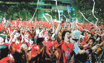 “我們所到之處只有勝利!”3日晚,韓國國家隊將在烏茲別克斯坦塔什幹舉行的2006德國世界盃亞洲地區最終預選賽客場挑戰烏茲別克斯坦隊。250多名紅魔助威團爲給韓國足球健將加油助威,于當天下午啓程前往當地。圖爲,出國之前,在仁川機場高喊口號表示堅定決心的紅魔助威團。