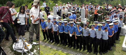 圖爲,6日來到大田國立墓地的民族問題研究所成員和民主勞動党黨員等100余人,正在砸毀前總統全鬥煥放在俞學聖墓地前的紙花(左)。當這些人涌向陸軍特務部隊隊長金昌龍(音)的墓地時,警方和保安開始出面警備。