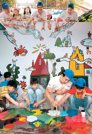 韓國P&G的職員迎接創立16周年,於7日來到位於首爾鍾路區社稷洞的殘疾人教育機關——“首都愛心學校”,與殘疾兒童一起在學校的牆壁上畫著想象中的大海風景。