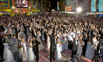 圖爲,9日,配合在美國內華達州拉斯維加斯舉行的“古老的100對佳偶證婚”活動,舉行婚禮的100對新婚夫婦正在慶祝。娛樂和賭博城市——拉斯維加斯今年迎來建城100周年,接連舉行了100對佳偶證婚等各種活動