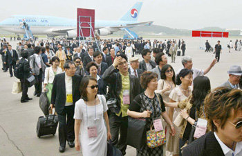 參加6•15南北共同宣言5周年紀念統一大慶典的南方民間代表團於14日上午從仁川機場出發,通過西海直達航線,于上午10時抵達了平壤順安機場。南方代表團受到了北方代表團的迎接,然後分別乘坐15輛客車,前往平壤高麗酒店
