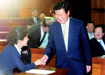 參加15日在首爾汝矣島國會憲政紀念館舉行的“爲了民族統合、國民統合、地區統合的討論會”的大國黨代表朴槿惠(左)正在與讀完祝詞走下講臺的民主黨代表韓和甲握手。