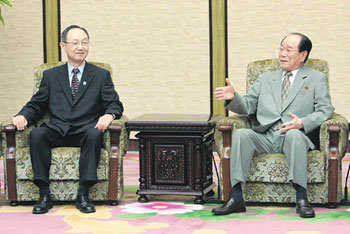 圖爲,16日上午正在參加6•15共同宣言5周年統一大慶典的南方籌備委員會常任代表白樂晴(左)等20名民間代表團在平壤萬壽台議事堂與北韓最高人民會議常任委員長金永南(左)進行面談。
